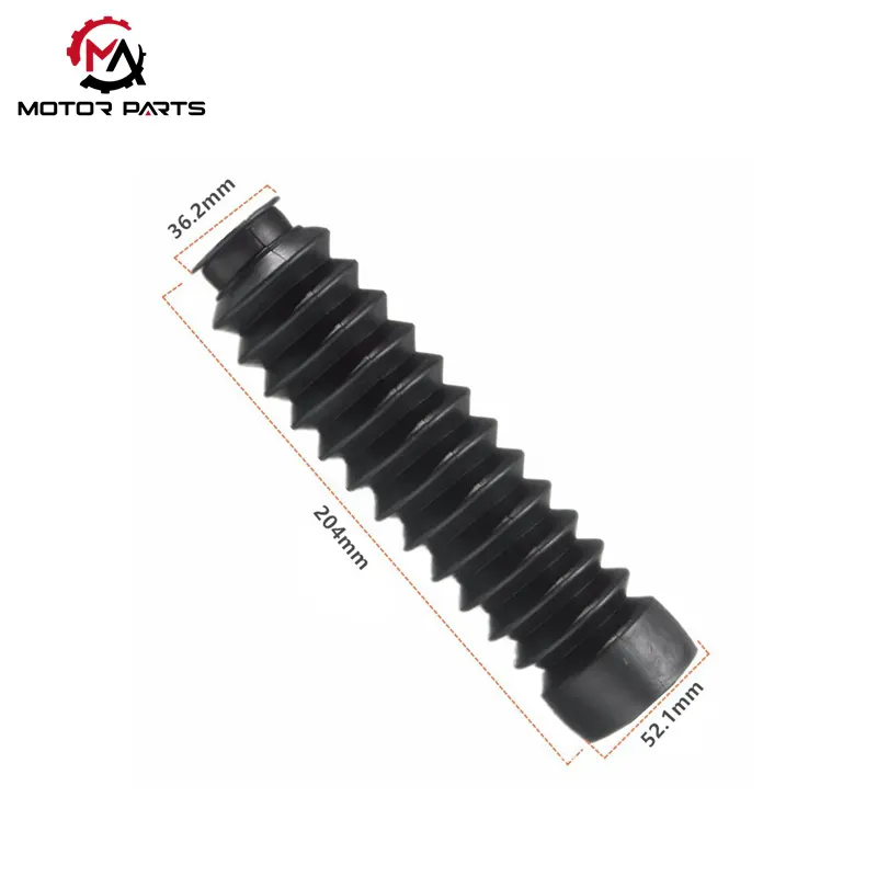 Το μπροστινό κάλυμμα σκόνης αμορτισέρ της μοτοσικλέτας είναι κατασκευασμένο από εξαιρετικά ελαστικά και μαλακά υλικά, τα οποία μπορούν να μετριάσουν αποτελεσματικά τους ανεπαίσθητους κραδασμούς που προκαλούνται από τη διαστολή και τη συστολή του αμορτισέρ, ενώ μειώνουν σημαντικά τον θόρυβο που προκαλείται από τους κραδασμούς βελτιώνοντας παράλληλα την οδηγική άνεση. Ορισμένα προϊόντα είναι ειδικά σχεδιασμένα με παχύρρευστες δομές, οι οποίες αυξάνουν το βάρος κατά 30% σε σύγκριση με τα συνηθισμένα μοντέλα. Μπορούν να αντισταθούν σθεναρά σε εξωτερικές κρούσεις, όπως κρούσεις από μικρές πέτρες και γρατσουνιές από κλαδιά δέντρων, παρέχοντας ολοκληρωμένη προστασία στα αμορτισέρ.
